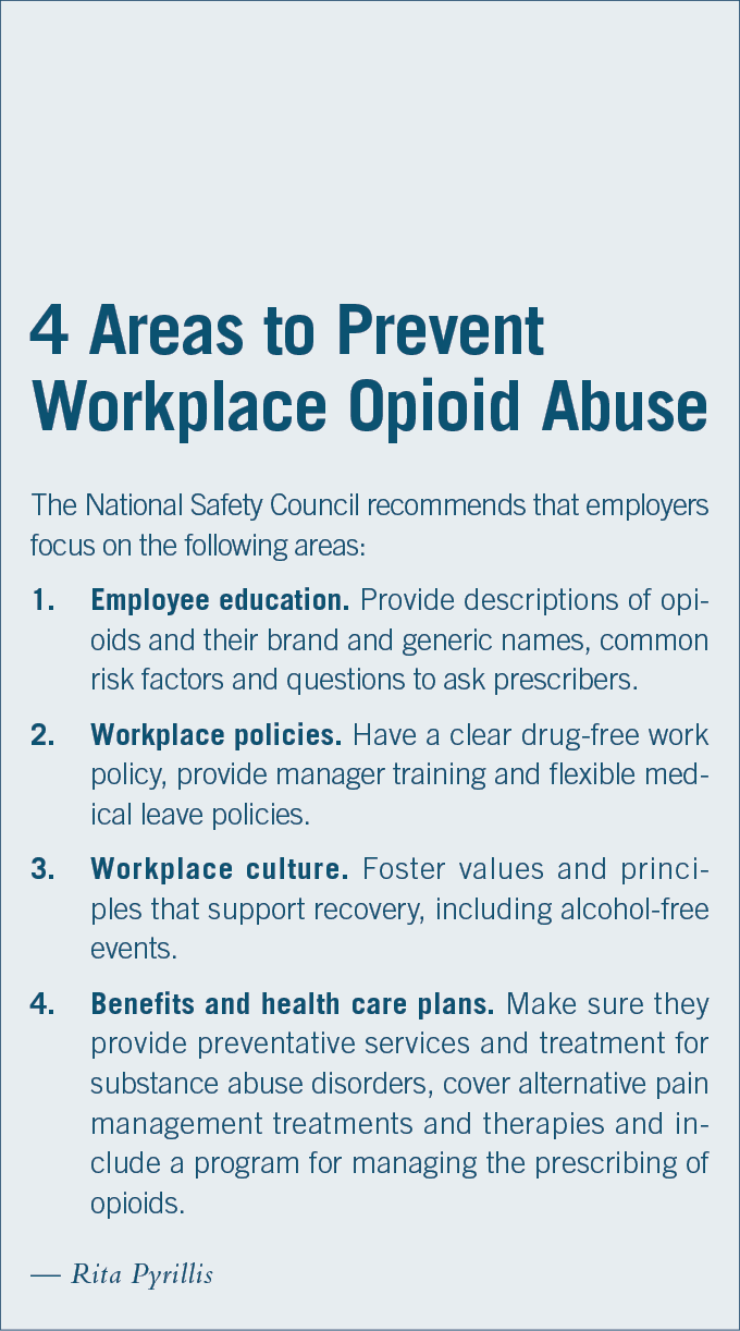 The NSC also recommends working with health care plans to ensure that mental and behavioral health services are covered, encouraging annual screenings for substance abuse, making sure that alternative pain management treatments, such as non-opioid medications, acupuncture, and chiropractic and physical and occupational therapy are covered, and providing or enhancing EAP services.